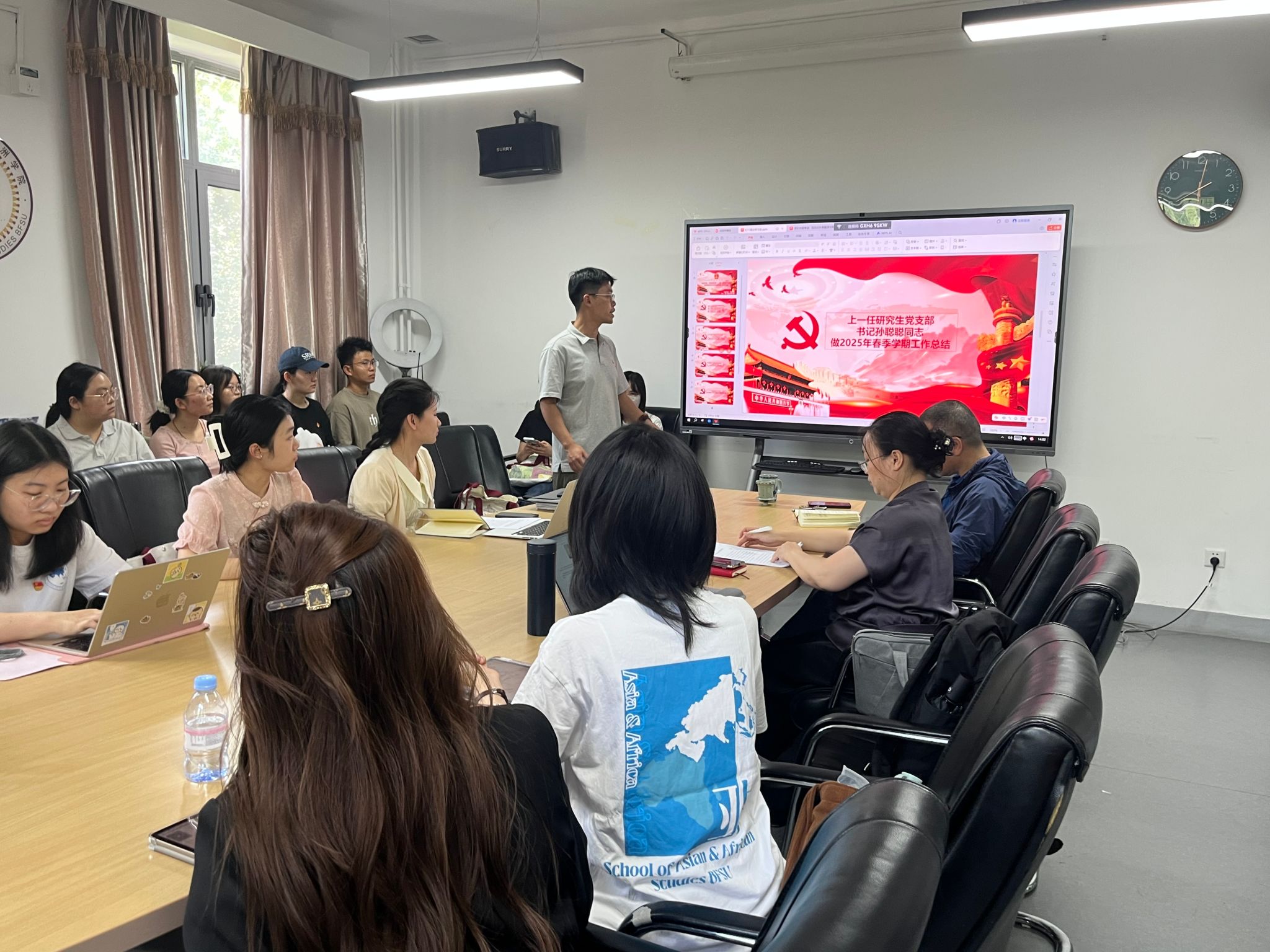 活动伊始,研究生党支部上一任书记孙聪聪同志对2025年春季学期研究生党支部的党员发展、理论学习与组织生活会等工作进行了总结。随后,亚洲学院、非洲学院党总支组织委员李亚兰宣布研究生支部从2025年6月1日起分为两个支部开展工作,并宣布党总支对于新任支委的任命。亚洲学院、非洲学院党总书记许晔对上一届支委的工作表示肯定,强调了凝聚力对于党支部开展工作的重要性,并对新一任支委和党支部提出要求与期望。