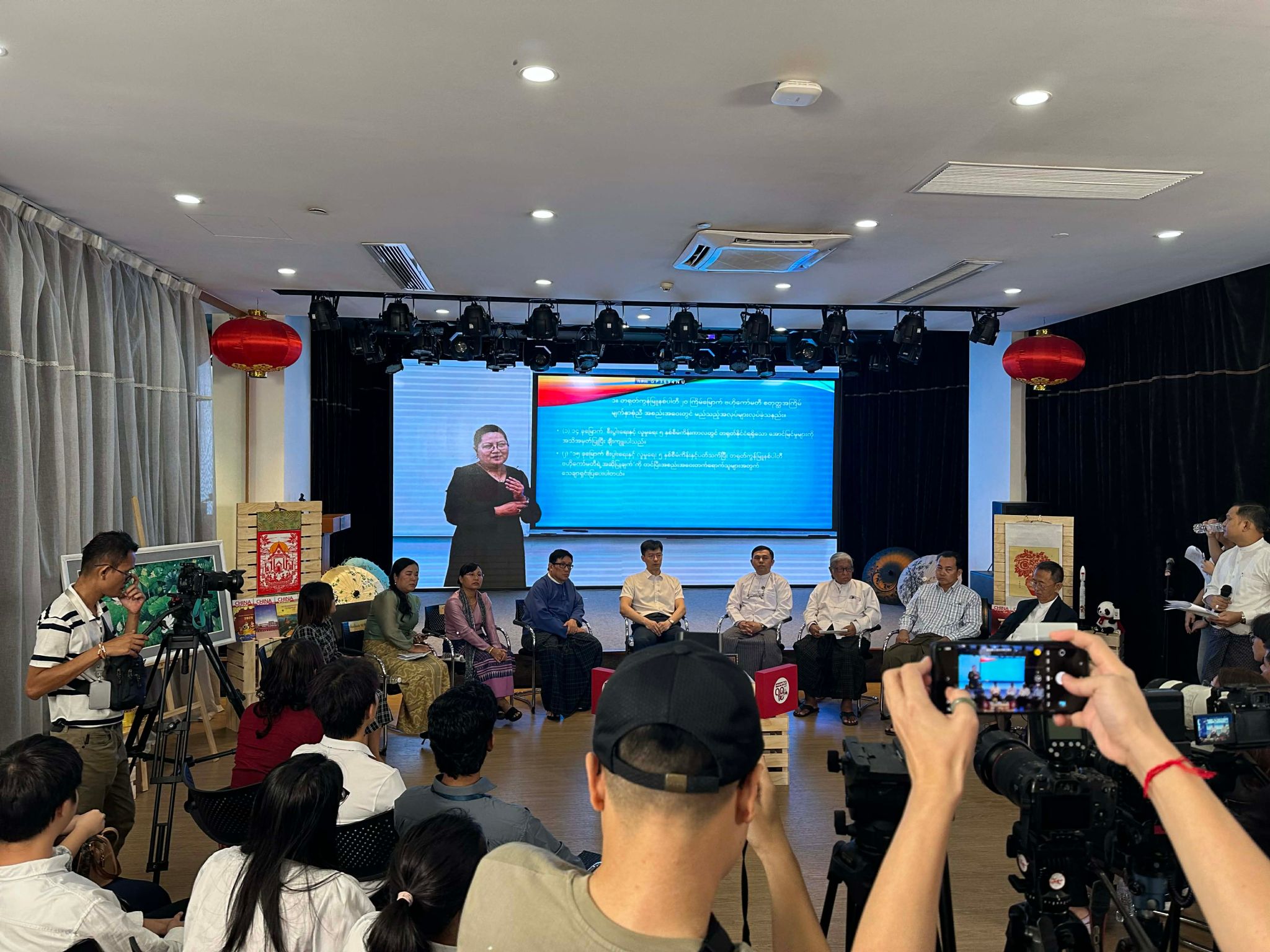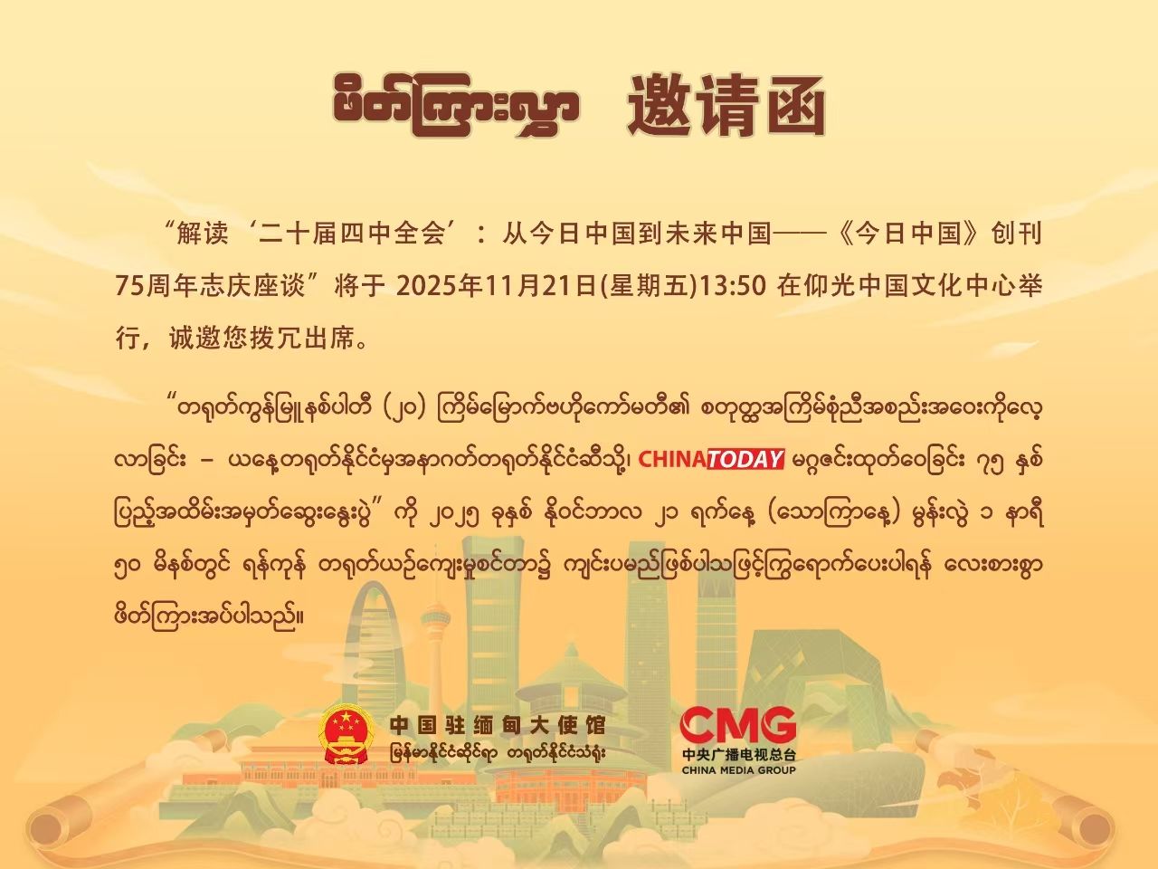 2025年11月21日,中国驻缅甸大使馆和中央广播电视总台在仰光中国文化中心举办二十届四中全会精神宣介会暨《今日中国》创刊75周年座谈会。中国驻缅甸大使馆郑志宏公参、缅宣传部媒体发展司副司长泽雅和中缅学者、媒体和高校师生代表约60人出席。其中北京外国语大学亚洲学院缅甸语专业师生线上参与此次座谈会。