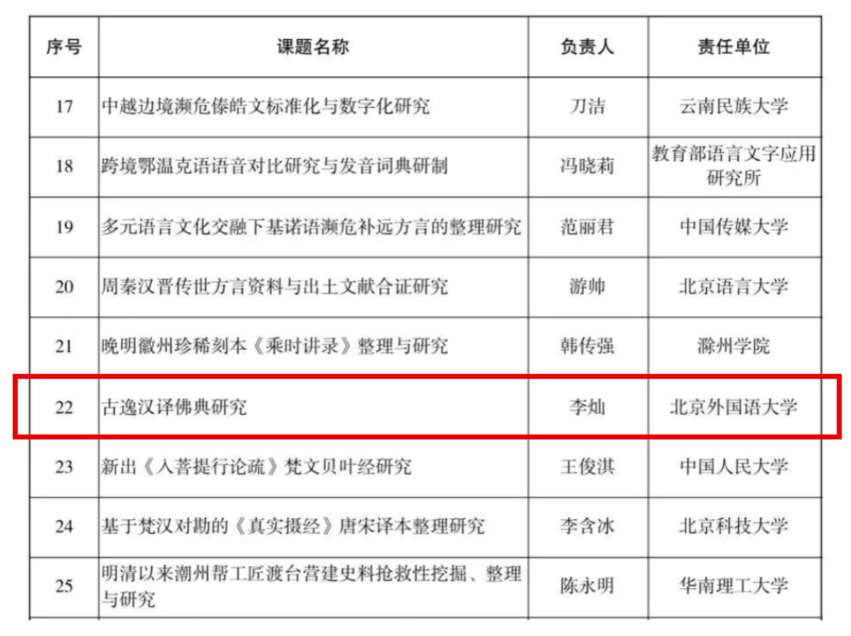 近日,全国哲学社会科学工作办公室公示2025年国家社科基金冷门绝学研究专项立项名单。亚洲学院李灿副教授申报的研究项目“古逸汉译佛典研究”获批立项,为亚洲学院新增一项国家社科基金冷门绝学研究专项。具体内容如下: